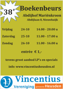 Dat kost allemaal veel geld en daarom hopen we dat er ook dit jaar weer veel mensen naar onze boekenbeurs komen. De beurs opent op vrijdag 24 oktober om 14.00 uur en is open tot zondag 26 oktober om 16.00 uur, wederom op het terrein van Abdij Mariënkroon in Nieuwkuijk. De entree bedraagt € 1,- en een boek slechts € 2,-. Mensen met een Heusdenpas mogen op vertoon van de pas op zaterdag en zondag gratis binnen en 10 artikelen naar keuze meenemen. Dat kunnen boeken zijn, maar ook LP’s en – voor de laatste keer! – CD’s en DVD’s. Want CD’s en DVD’s worden vanaf nu ook niet meer ingenomen op maandagmiddag omdat er niet veel belangstelling meer voor is.